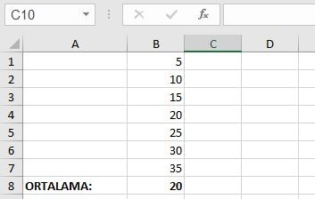 Bu örnek formülü yazdığınız hücreye B1 ve B7 aralığındaki hücrelerde bulunan sayıların ortalamasını yazacaktır.