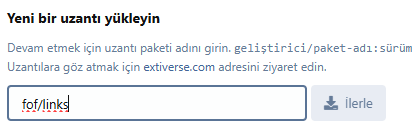 Extension Manager'a tıkladıktan sonra açılan sayfanın sağ tarafında bulunan Yeni bir uzantı yükleyin başlığının altındaki alana eklenti paket adını girip İlerle butonuna tıklayarak eklentiyi kolayca yükleyebilirsiniz.