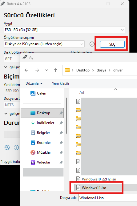 Açılan pencerede ilk kısımdan bilgisayarınıza bağladığınız USB belleği hemen altında ise kurulumunu yapacağınız ISO dosyasını seçin.
