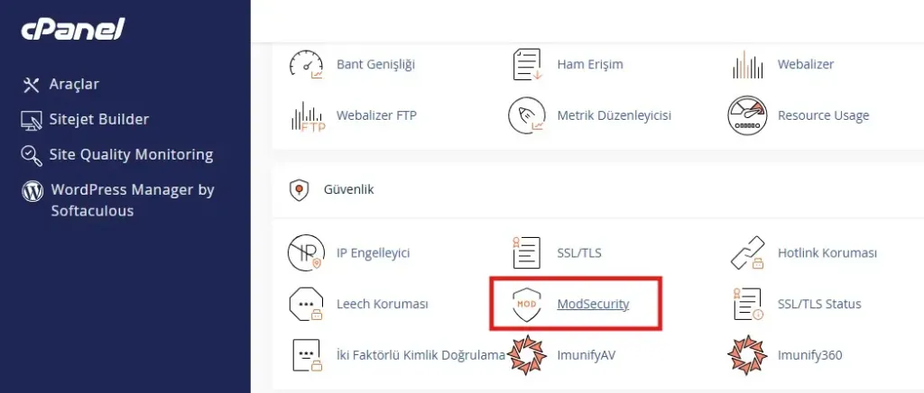 Öncelikle web sunucunuzun CPanel arayüzüne giriş yapın ve bu ekrandaki ModSecurity seçeneğini bulun. Eğer bulamıyorsanız arama bölümüne yazarak ulaşabilirsiniz.