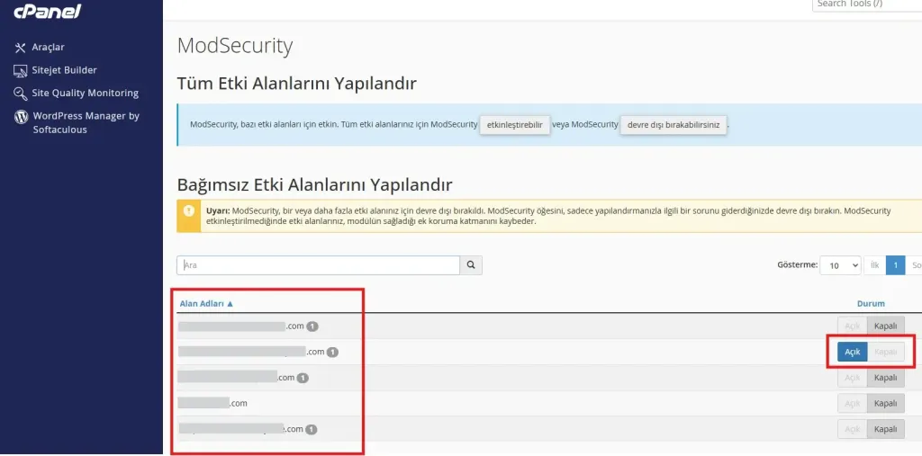 ModSecurity bölümüne girdiğinizde web sunucunuzda barındırılan alan adlarını göreceksiniz. Bunların arasından ModSecurity uygulamasını kapatmak istediğiniz alan adınızın karşısındaki butonu KAPALI konuma getirin.